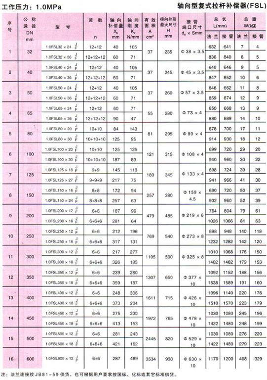 軸向型復(fù)式拉桿波紋補(bǔ)償器(FSL型)結(jié)構(gòu)簡單,補(bǔ)償量大,一般使用于低疲勞次數(shù),需大補(bǔ)償量的管線。